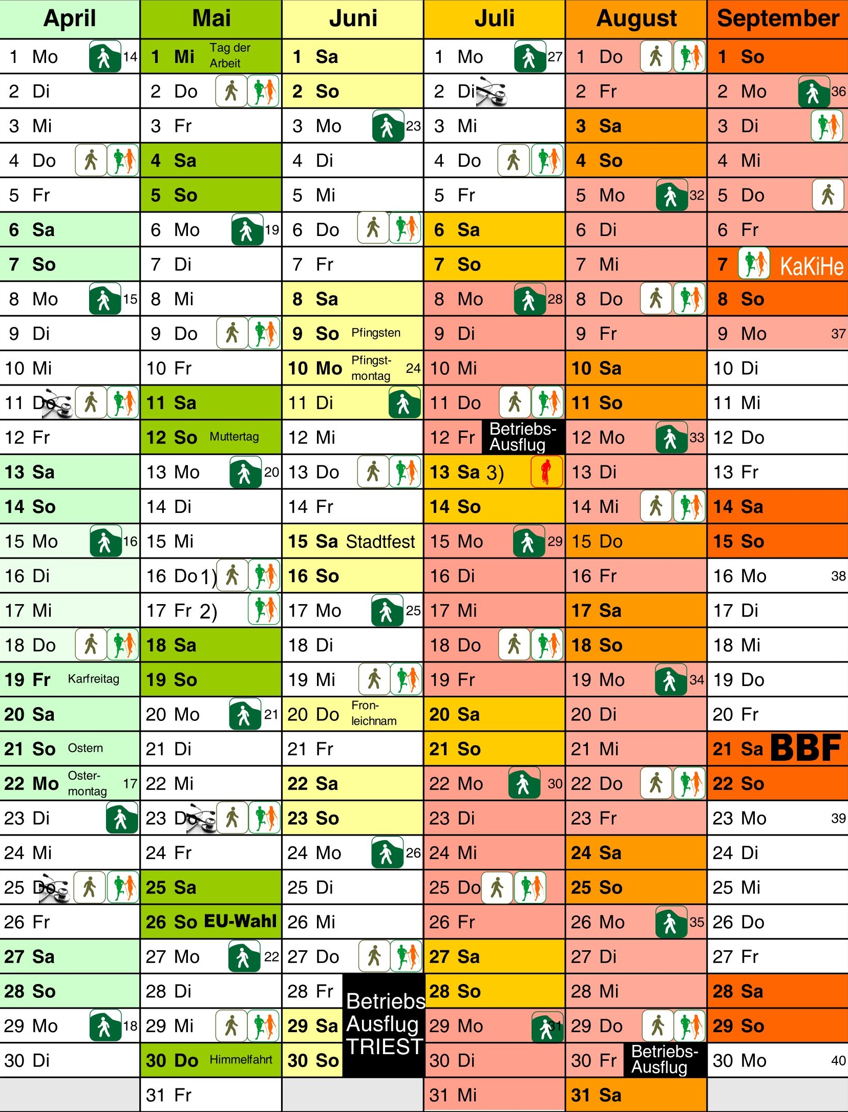 Hier findet Ihr die geplanten Aktivitäten des aktuellen Jahres. Etwaige Änderungen werden per WhatsApp bekannt gegeben. Die Aufnahme in die WhatsApp-Gruppe ist über die Aktivitätenverantwortlichen möglich.